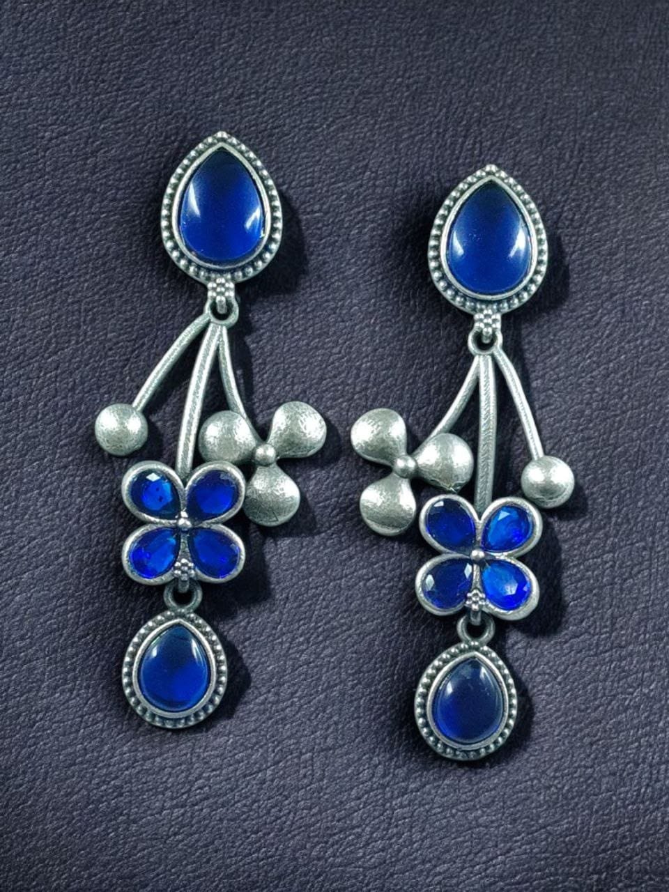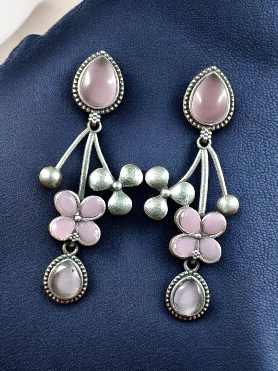 Beautiful Oxidized Flower Earring | Silver Replica Ethnic Stone Work Dangler Jewelry