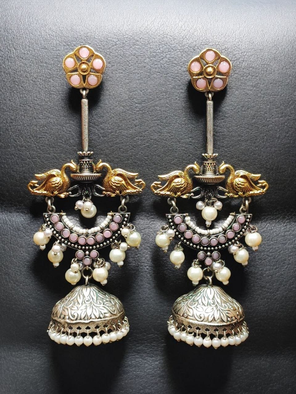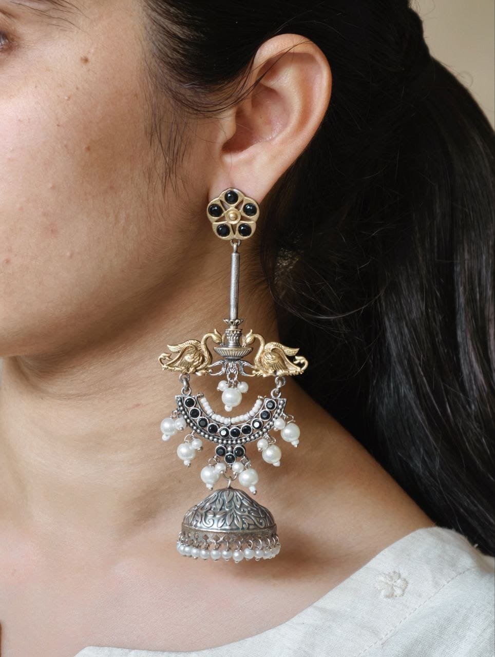 | Designer Two-Tone Jhumka Earrings featuring a graceful bird design with pearl and stone work. Created for women who love statement jewelry with a blend of traditional beauty and modern luxury |