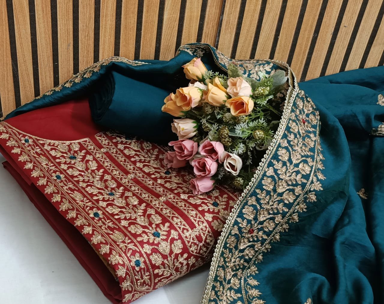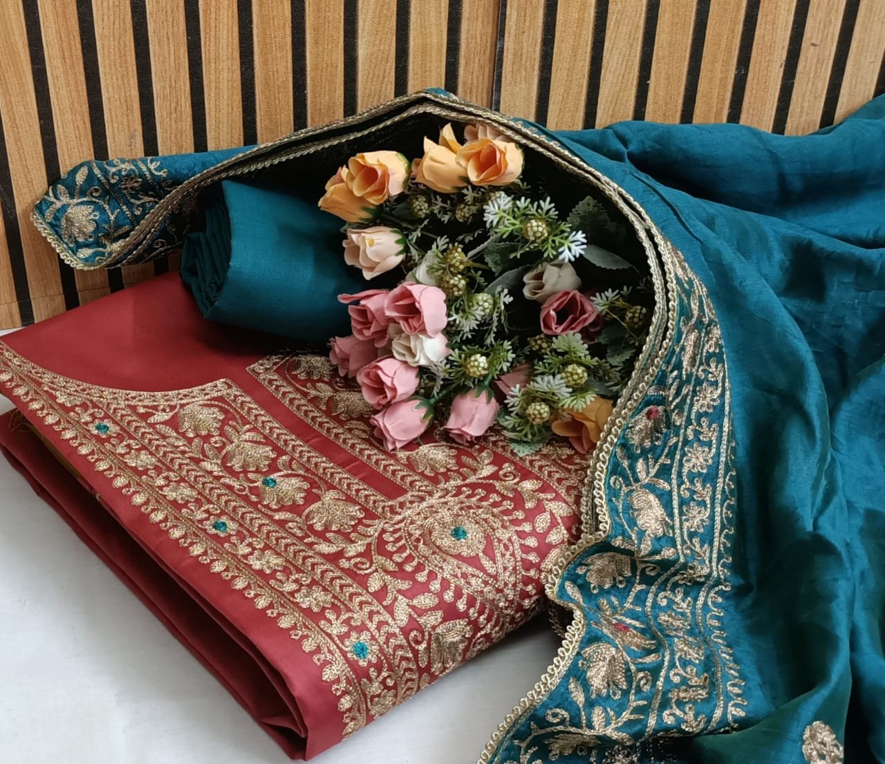 Elegant Embroidered Suit Set featuring rich thread and zari work that adds a royal touch to your ethnic wardrobe.