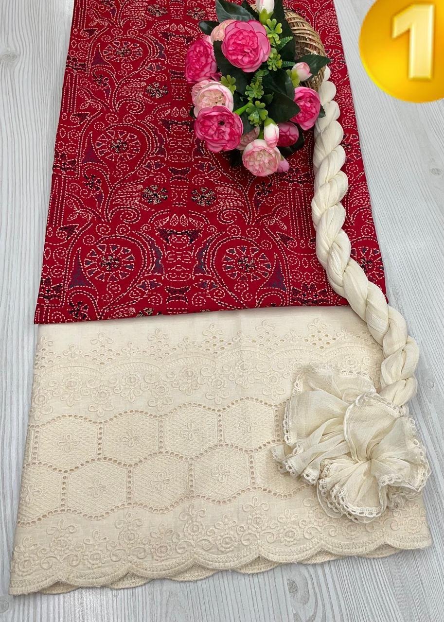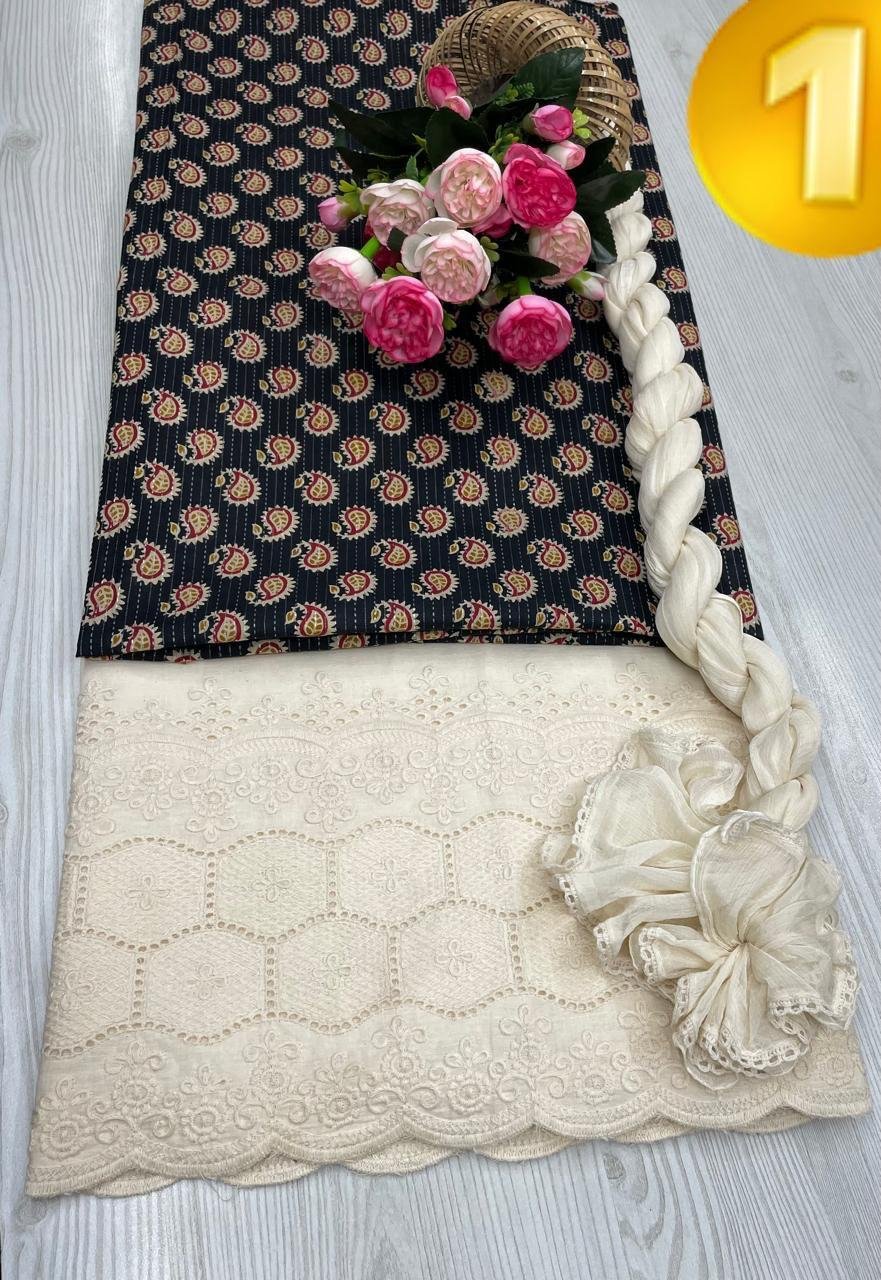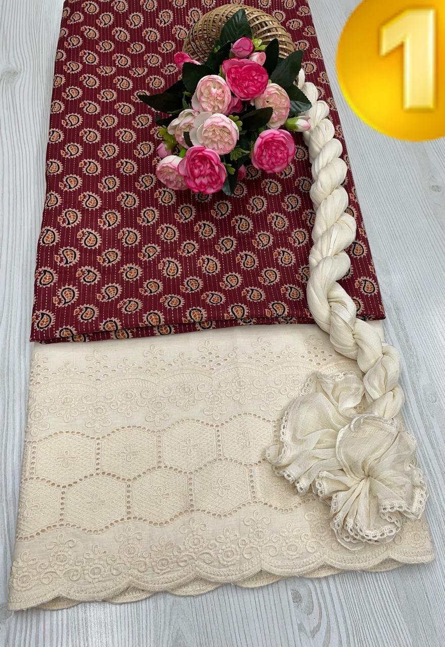Elegant Printed Cotton Suit Set paired with a beautifully crafted Lucknowi (Chikankari) embroidered bottom and a soft, stylish matching dupatta.