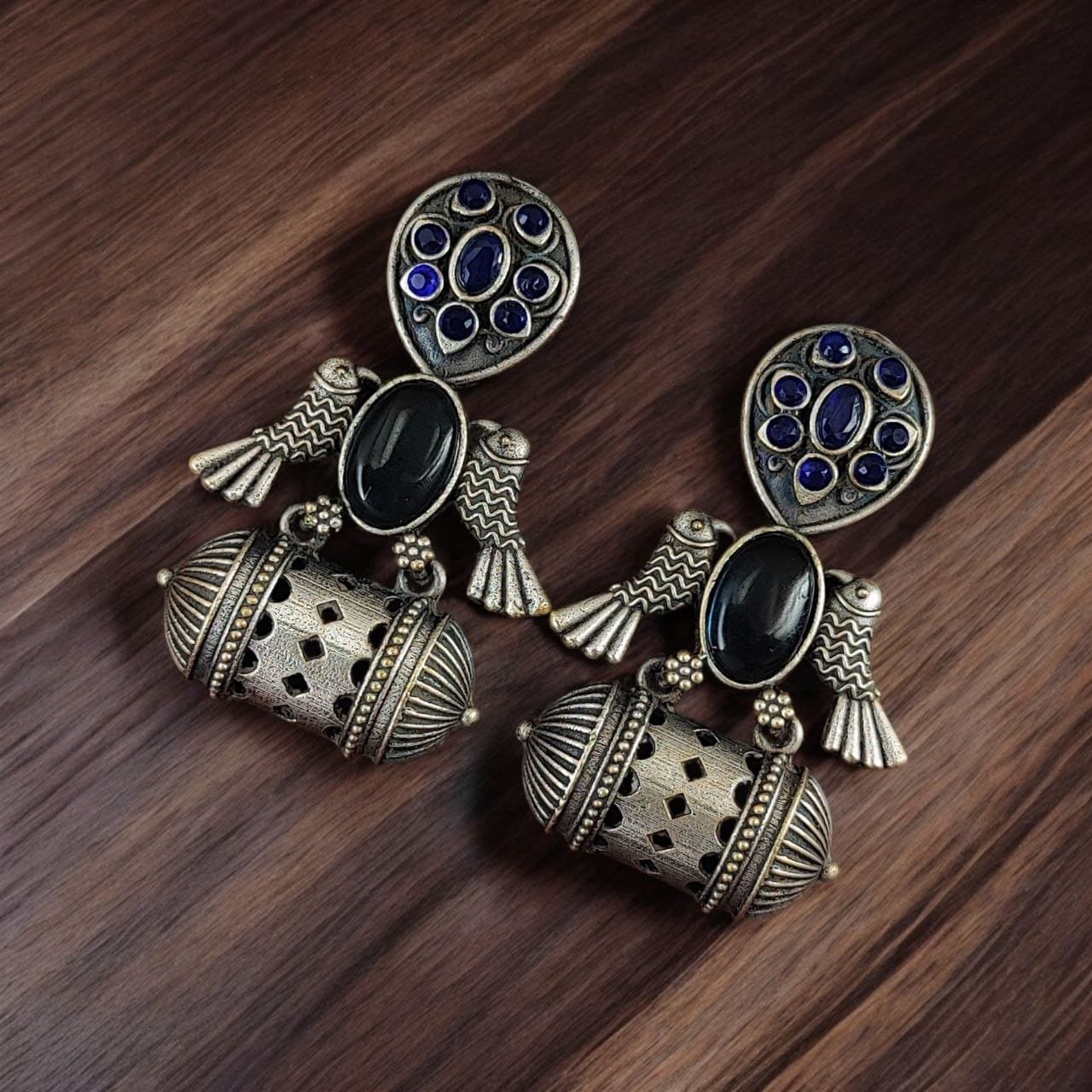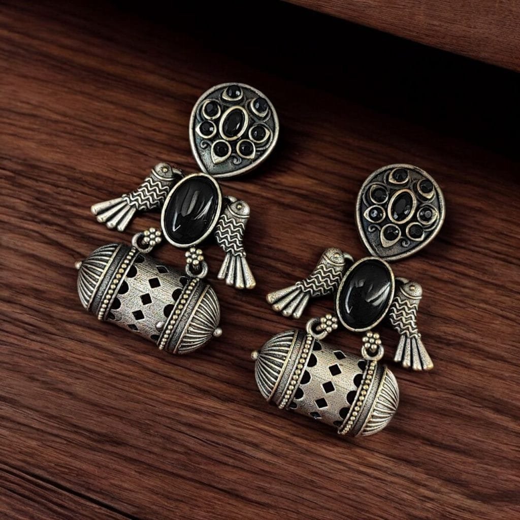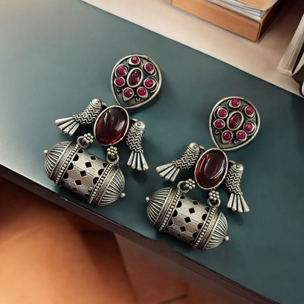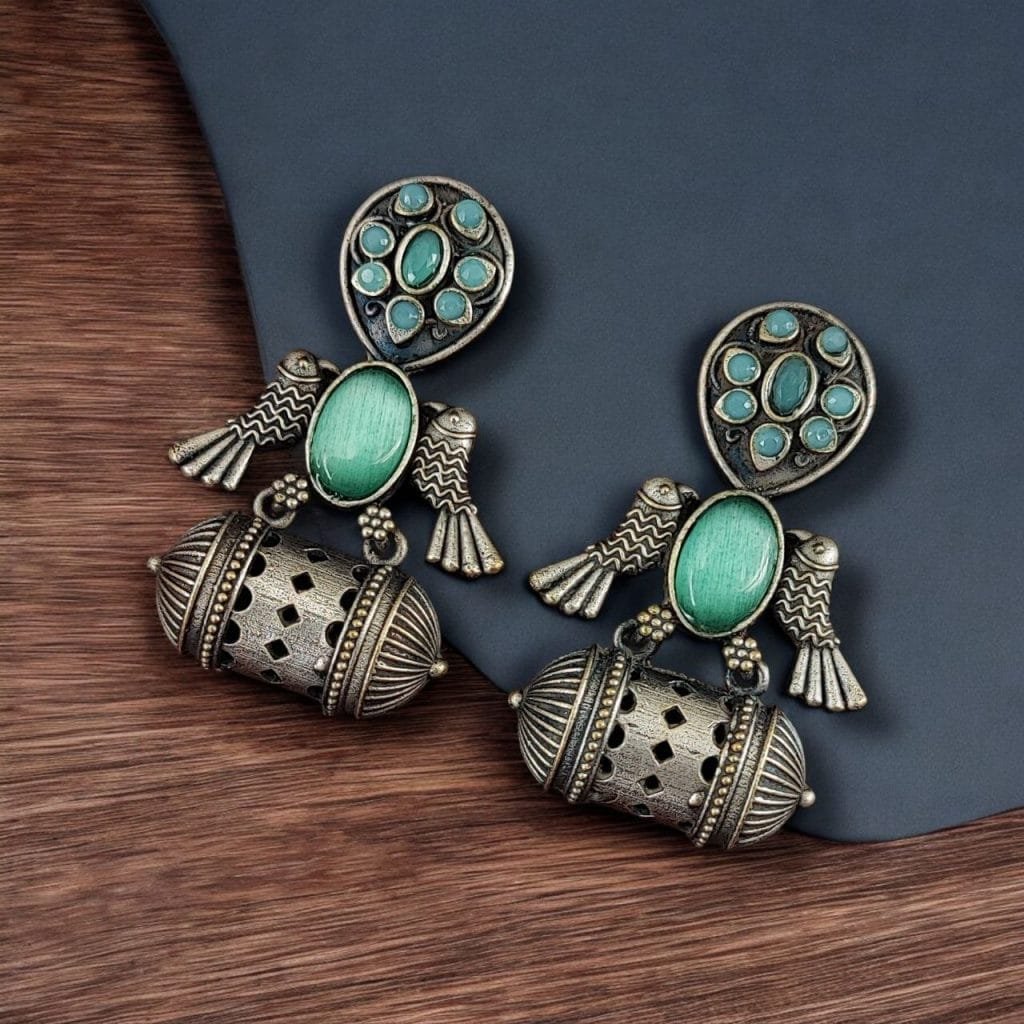 | Embrace the charm of timeless elegance with our Handcrafted Antique Silver Bird Jhumkis, designed for those who appreciate the beauty of traditional Indian craftsmanship. |
