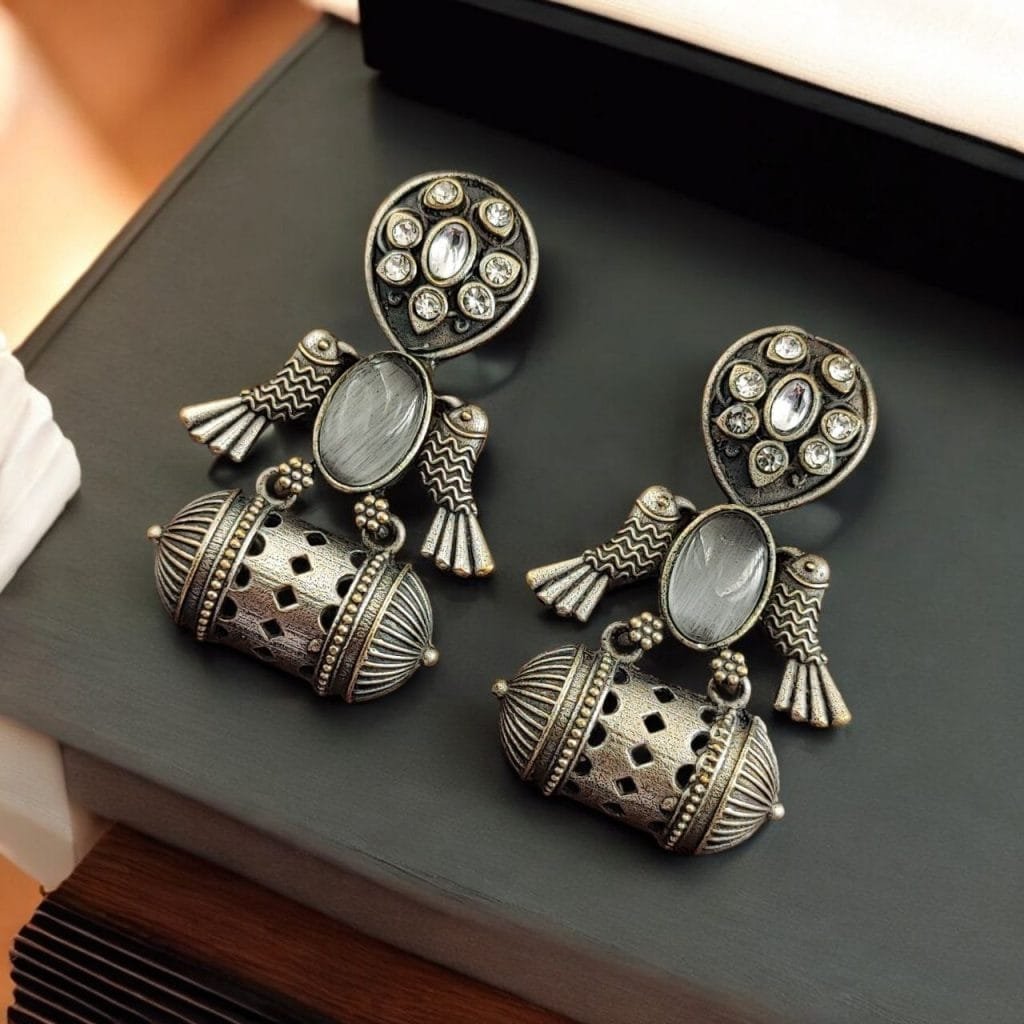 | The Handcrafted Antique Silver Bird Jhumkis are not only stunning but also lightweight, ensuring comfort even during extended wear |