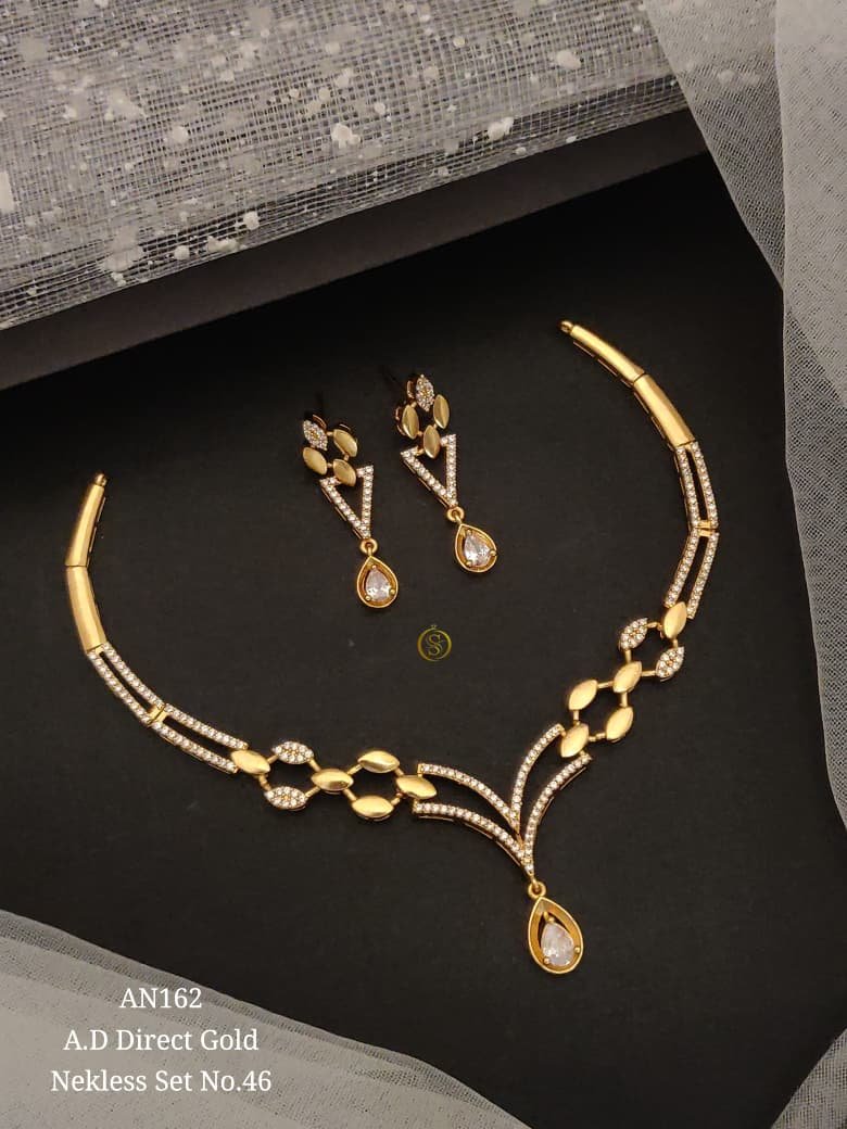 | Beautiful A.D. direct gold necklace set crafted with sparkling American diamonds and a classy modern design. Perfect for weddings, parties, and festive occasions. |