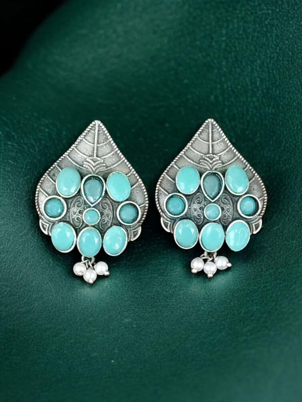 Traditional Leaf Design Earrings | Silver Replica Stone & Pearl Work Best Oxidized Jewelry