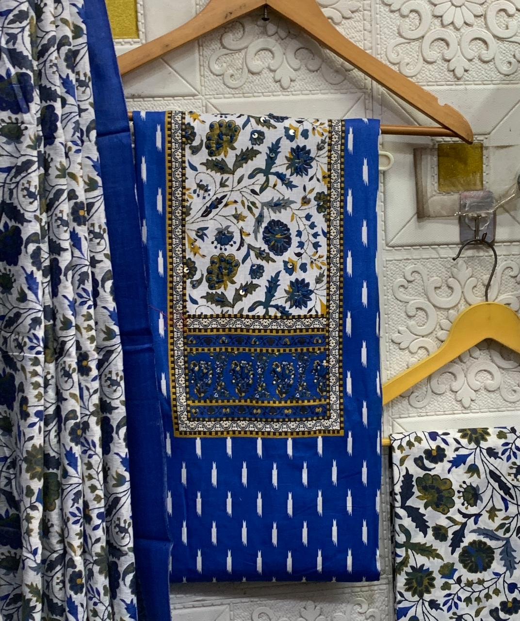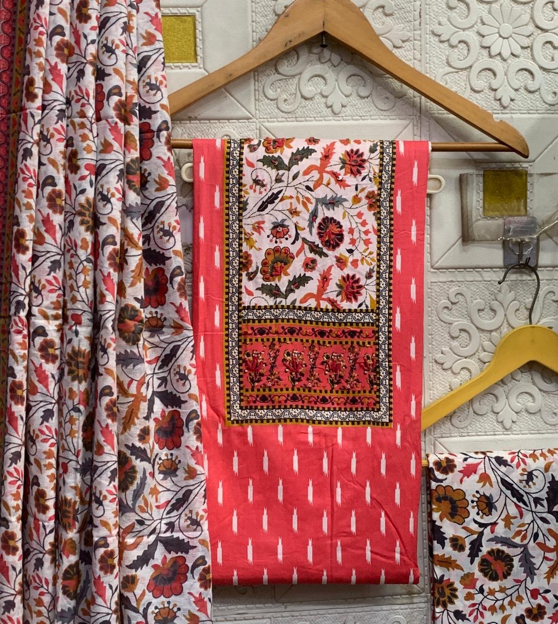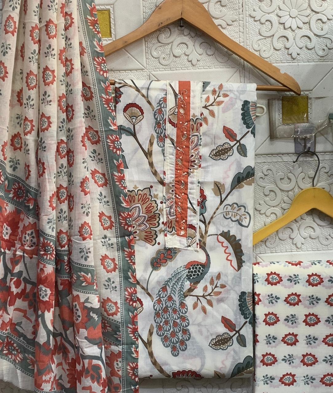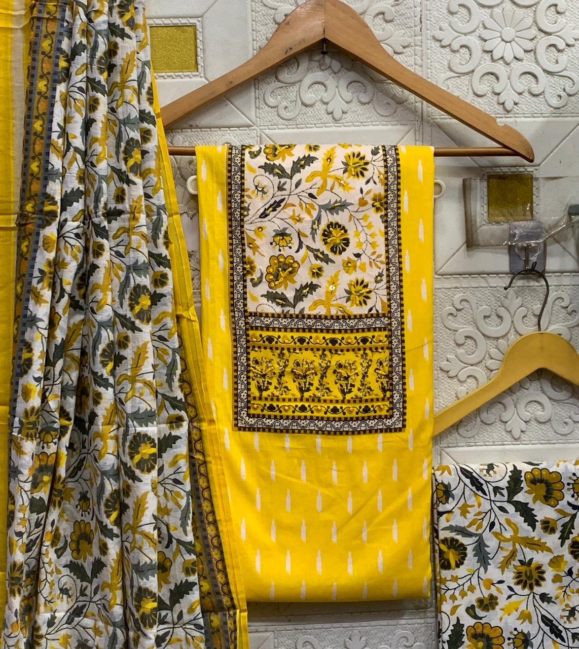 The kurta fabric is highlighted with a beautifully designed yoke-style panel, paired with a coordinated printed bottom fabric and a matching floral dupatta.